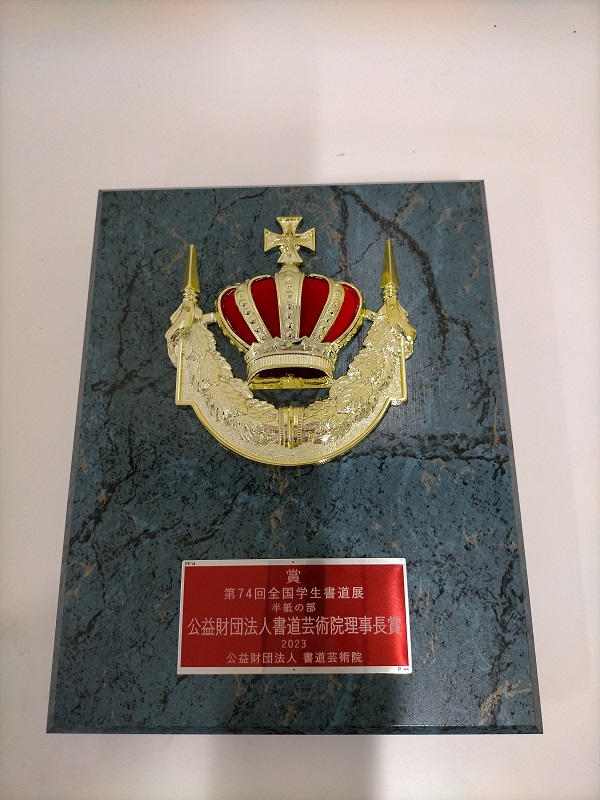 本校書道部に在籍しております、1年13組、山崎千砂都さんが「書道芸術院全国書道展 半紙の部」において、「公益財団法人書道芸術院理事長賞(第一位相当)」を受賞しました。