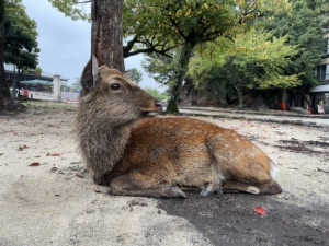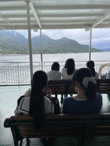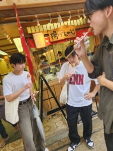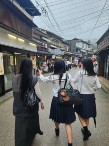 現地では,自由散策の時間を設け,生徒たちはそれぞれ思い思いの時間を過ごしました。厳島神社に参拝したり,商店街で名物のもみじ饅頭や揚げもみじ,焼き牡蠣などを楽しんだり,鹿とふれあう様子も見られました。天候の回復もあり,友人たちとともに笑顔あふれるひとときを過ごしていました。