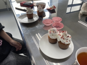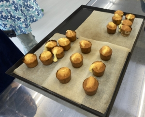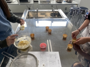 まず,生徒たちはグループごとに計量や混ぜ方を確認しながら,生地を丁寧に作りました。焼き上がる香ばしい甘い香りに教室中が包まれ,自然と笑顔が広がっていきました。焼き上がったカップケーキには,それぞれが自由にトッピングを施し,クリームやチョコレート,ハロウィーンモチーフの飾り付けで個性あふれる作品を完成させました。完成したカップケーキはどれも見た目も味も素晴らしく,互いの作品を見せ合いながら楽しむ姿が印象的でした。