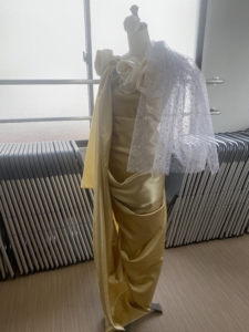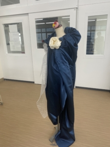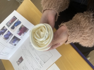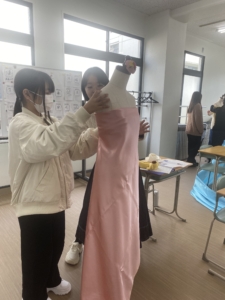 はじめは,布がどのようにしてドレスの形になるのか想像できず,戸惑う様子も見られました。しかし,講師の指導のもと,一つひとつの工程を丁寧に学ぶうちに,立体的な構造の理解が深まり,次第に自分の手で形を生み出す楽しさを感じられるようになりました。