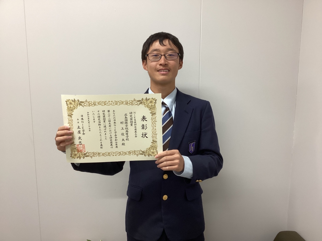 2人目は、9月27日開催された「第22回日本NIE学会全国大会(於:愛知東邦大学)」で企画、実施された「生徒研究発表」において、発表した村上俊太君です(G1-2)。
