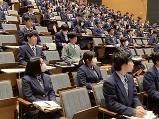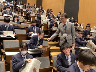 まずレディネスとして、先週(1月15日)、本校教員によるNIEを導入する理由について講義を行い、今週は「文章作成、資料の分析、他者評価」を専門とされる方をお招きして、生徒たちの書く力、読み解く力を全員で学びました。