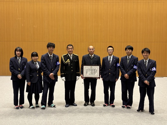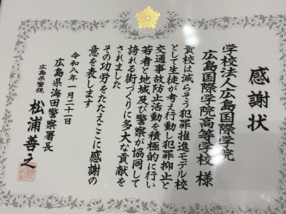 1月21日、本校高等学校は広島県海田警察署より、今年度の諸活動を評価していただき、海田警察署長の名で「感謝状」をいただきました。