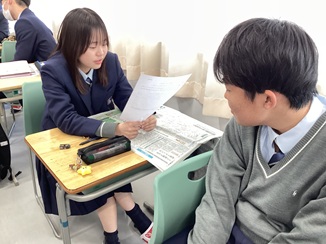 ②文章作成後、意見交流会を実施。前回話し合った人と変えて、話し合いをしました。また、交流会をする前に、相手となる人に「自らが選んだ記事を読んでもらう」を加えて進めていきました。