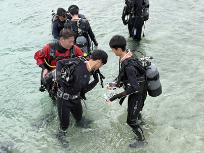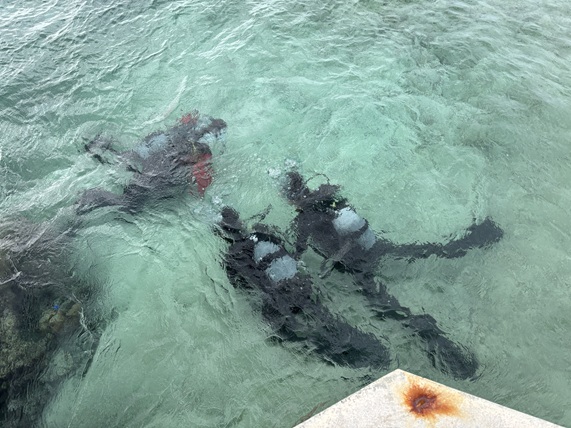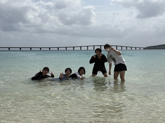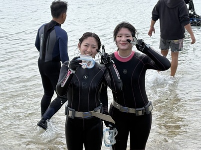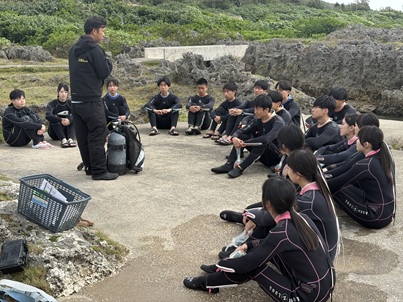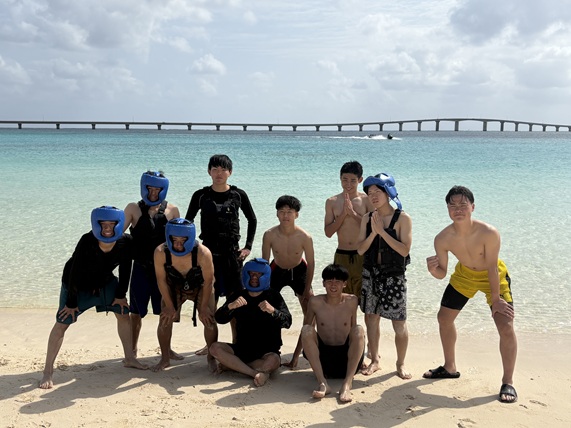 午前はシギラビーチでダイビング体験を行いました。到着後に海の青さと透明度の高さに全員が驚きました。