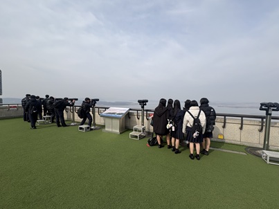 室内の施設で動画や模型を見ながら統一展望台について学んだ後、屋外で望遠鏡を使って実際に北朝鮮を眺めました。