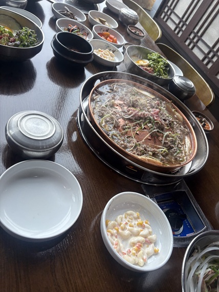 途中、昼食は、韓国料理「プルコギ」を食べました。プル(火)でコギ(肉)を焼く料理…という意味だそうです。焼肉と異なる点は、甘いタレに、肉・野菜等をつけこんで焼くが異なるようですね。