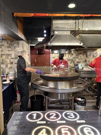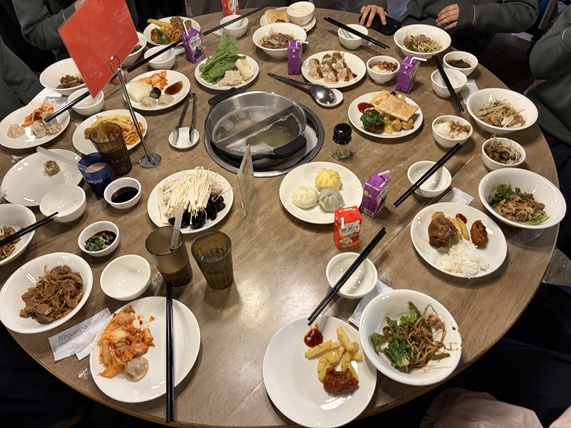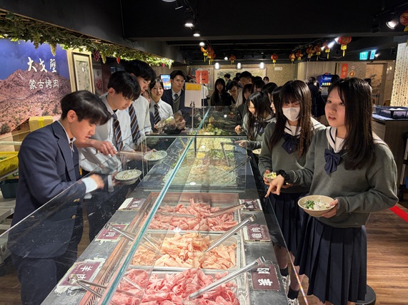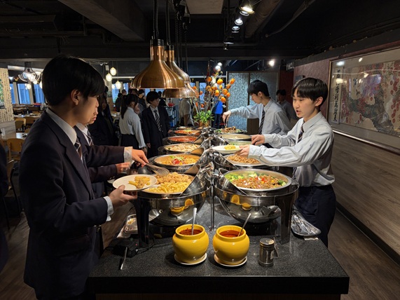 夕食はモンゴリアンBBQでした。自分で好きな具材や味付けを選び、鉄板で調理してもらうスタイルで、普段とは少し違う食事の形に生徒たちも楽しそうな様子でした。