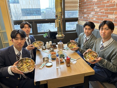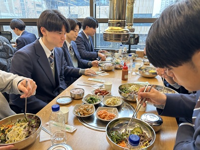 体験後、一行は昼ごはんにビビンバを食べました。これまでの韓国料理もそうですが、日本で食べるものと本場の味は全く違います。多様なトッピングは美味しさだけでなく、美容、健康を考えたものです。ビビンバを頬張り、日本との違いを楽しみながら食べていました。