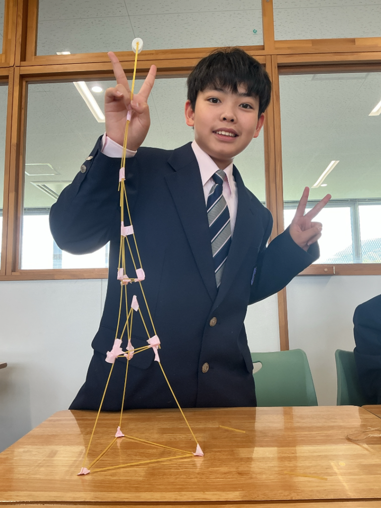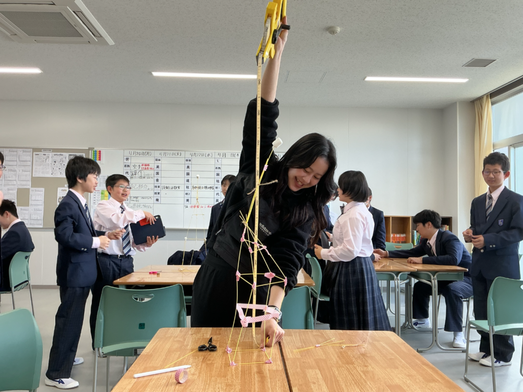 最初は「余裕だよ!」と意気込んでいた生徒たちですが、いざマシュマロを乗せると、その重みでタワーがポッキリ折れてしまうチームが続出!「土台をもっと強くしよう」と、作戦会議は白熱。あちこちから歓声や悲鳴が上がる、非常ににぎやかな時間となりました。