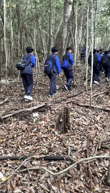 下山道にはロープを使わなければ降りることのできない険しい道や、滑りやすい枯葉が敷き詰められた道など、登りの時より険しい道のりがありましたが、全員無事に学校に戻ることができました。