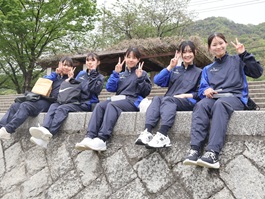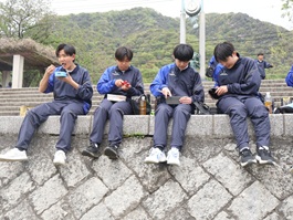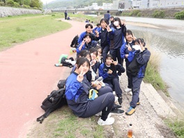 教室内でのオリエンテーションを終え、まずは河川敷に移動し昼食を食べました。クラスメートと話しながら食事を楽しんでいる様子から、入学して初めての校外活動にわくわくしていることが感じられました。
