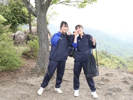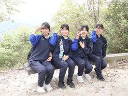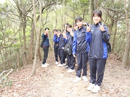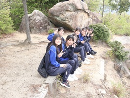 昼食後に全員で準備体操を行い、日浦山への登山をスタートさせました。近くを歩いている仲間と話しながら登っている生徒や、真剣に黙々と登る生徒など様々な姿が見られました。